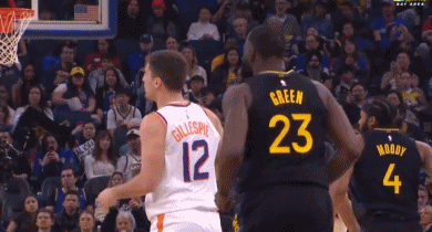 在比賽進行到第二節時,勇士內線德雷蒙德-格林在回防時突然從后面推搡了太陽后衛吉萊斯皮,在裁判吹停比賽后他還對著裁判做出技術犯規的手勢進行挑釁。