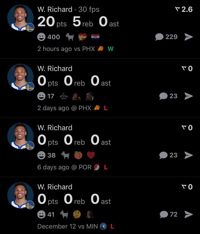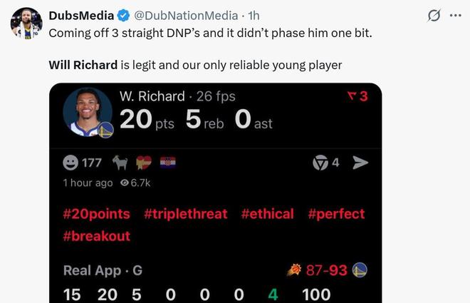 勇士媒體也曬出理查德本場比賽的表現,以及過去3場連續被DNP的安排,直言:“我不想再看到理查德被DNP,他是勇士唯一值得信賴的年輕人。”